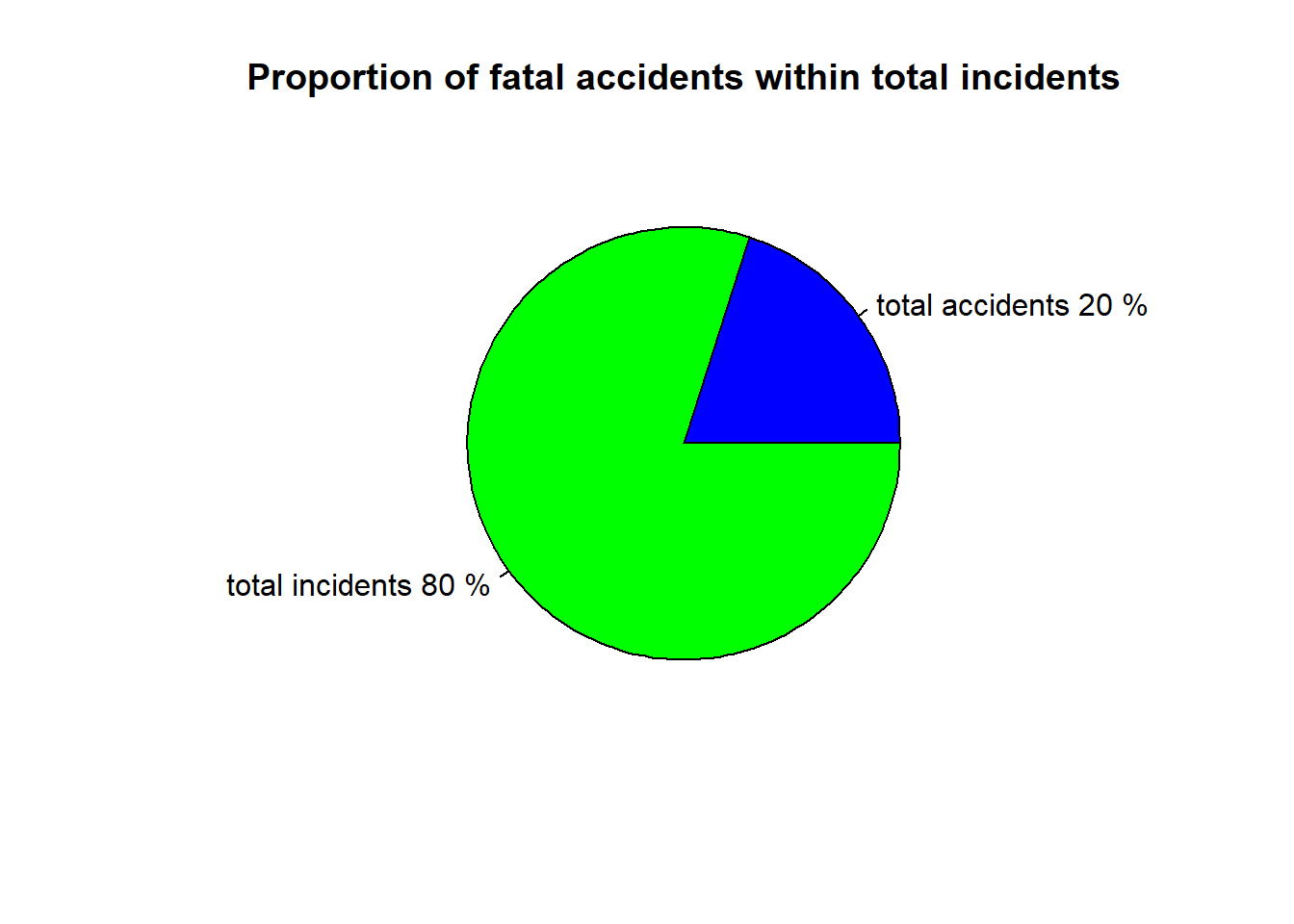 pie(values, labels = kpi1, col = c("blue", "green"), main = "Proportion of fatal accidents within total incidents")